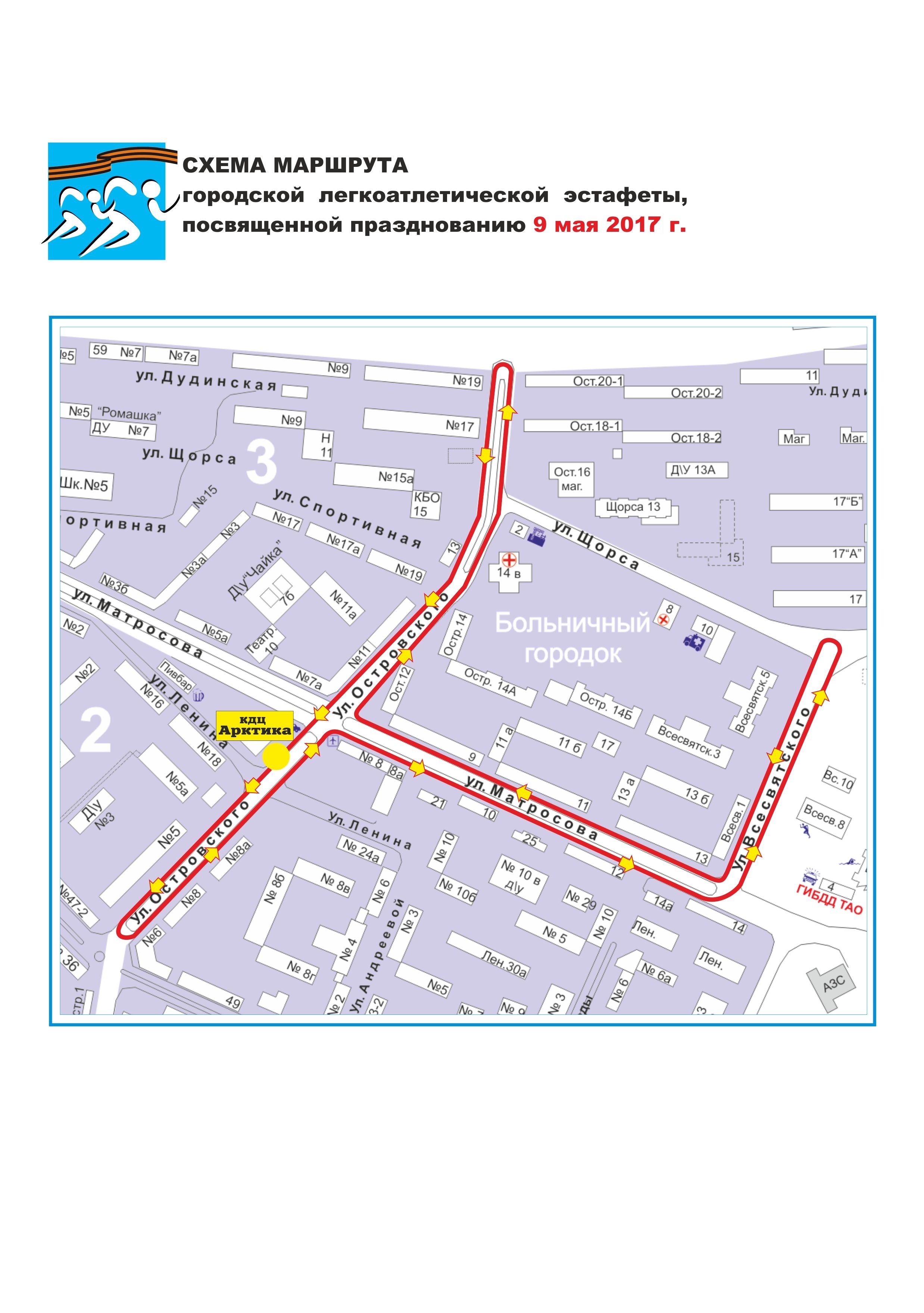 Старт эстафеты трудовых коллективов запланирован на 12:00 от кинодосугового центра «Арктика». Сразу после них забег продолжат студенты Таймырского колледжа и учащиеся общеобразовательных школ Дудинки. Перед стартом будет проведена акция «Георгиевская ленточка». В связи с этим администрация города информирует дудинцев о временном ограничении движения транспортных средств по улицам Дудинки 8 мая: с 11:30 до 13:30 по улице Островского, улице Матросова, улице Всесвятского, в соответствии с прилагаемой схемой.